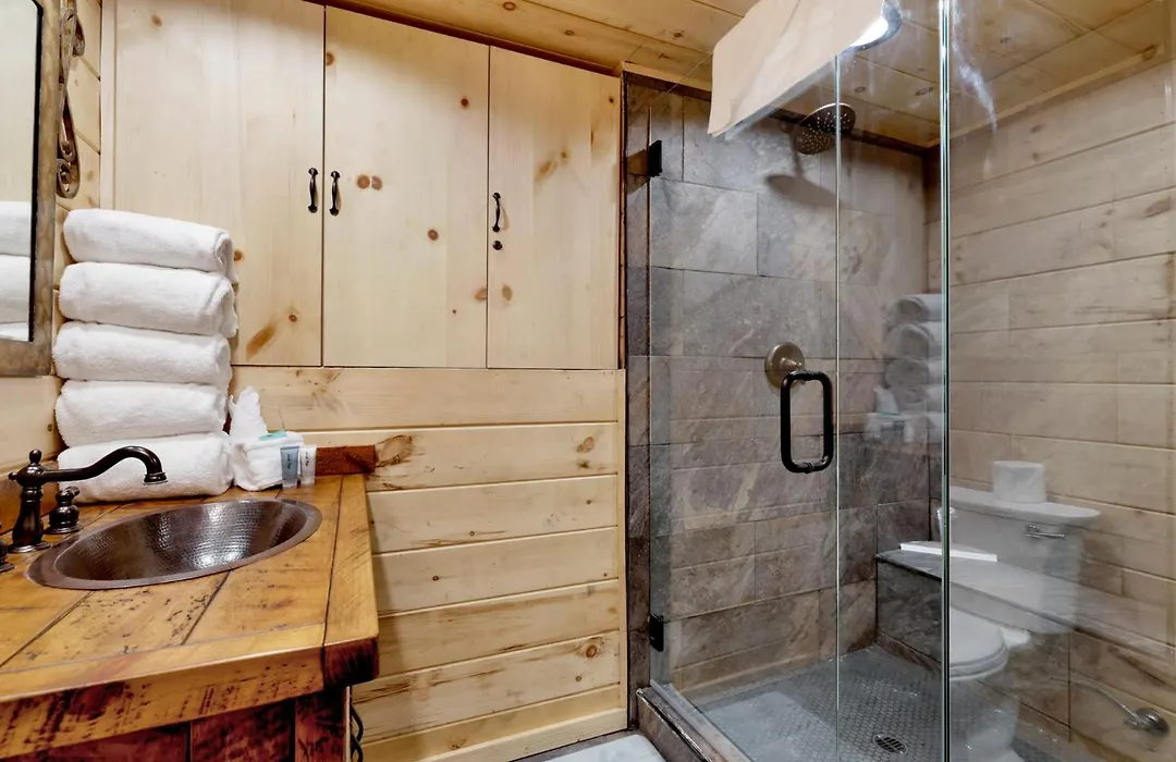 Cet établissement Top Notch Lodge#2056 comprend une salle de bains avec une toilette séparée, une douche et une machine à laver. Un sèche-cheveux et des draps de bain sont fournis pour le confort des clients.